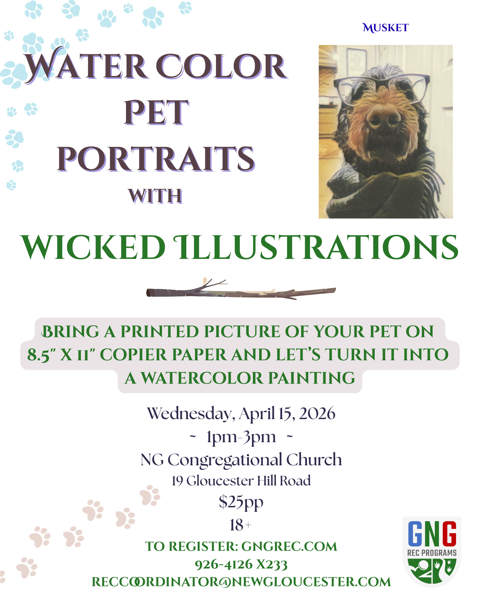 April 15, 2026 1pm-3pm, Water Color Pet Portraits Bring a printed picture of your pet on 8.5"x11" copier paper (or we can print it for you so bring the picture!). Wicked Illustrations will help turn that picture into your very own water color painting. All supplies included.