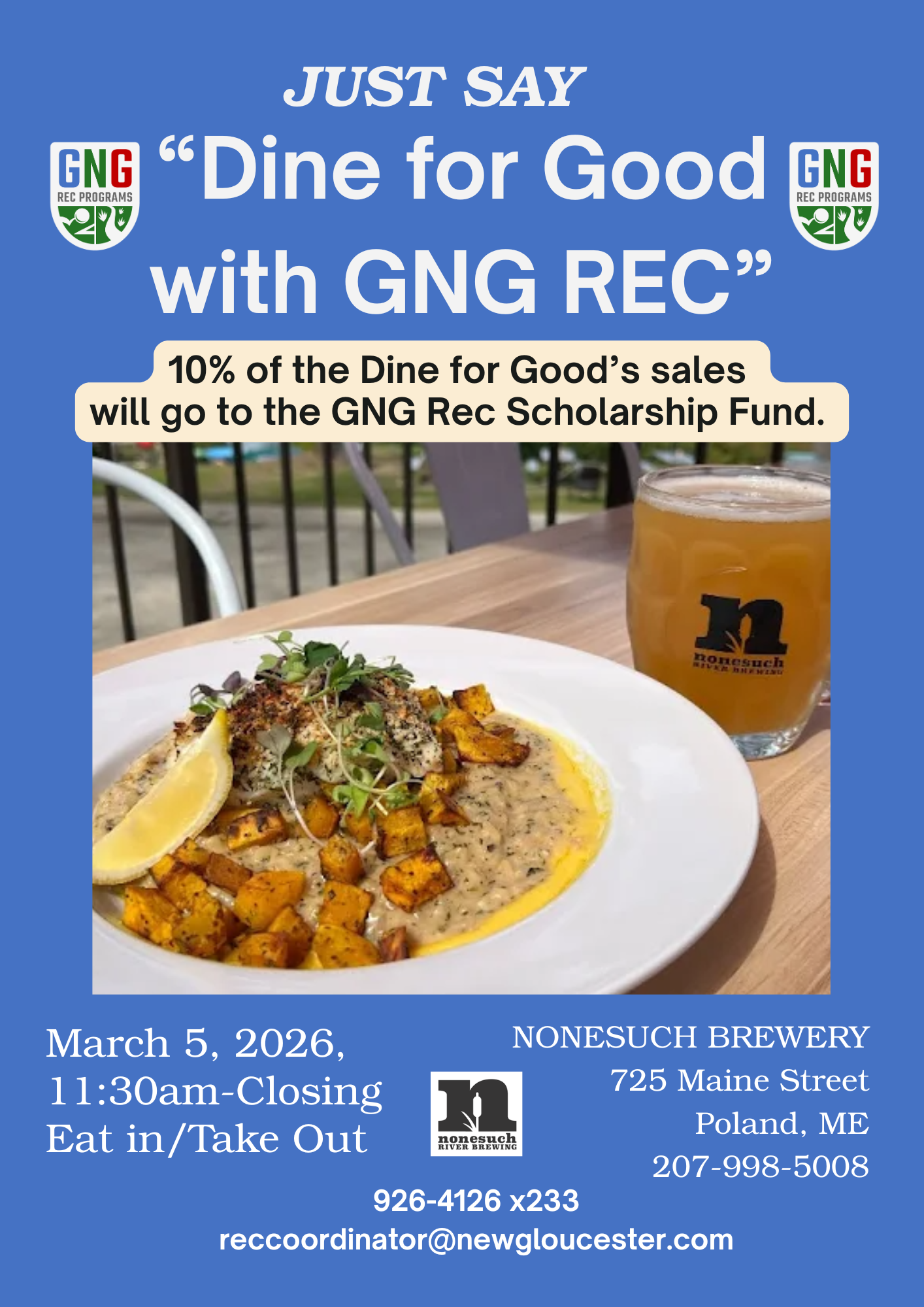 March 5, 2026 11:30am - Closing, Dine for Good at Nonesuch River Brewing in Poland ME - Dine in or Take out! Mention to your server that you are ordering for the GNG Rec Dine for Good Event and 10% of the all the Dine For Good sales that night will go to the GNG REC Scholarship Fund - a fund that is designed for families experiencing financial hardship and makes recreational accessible for any child in the GNG Community.