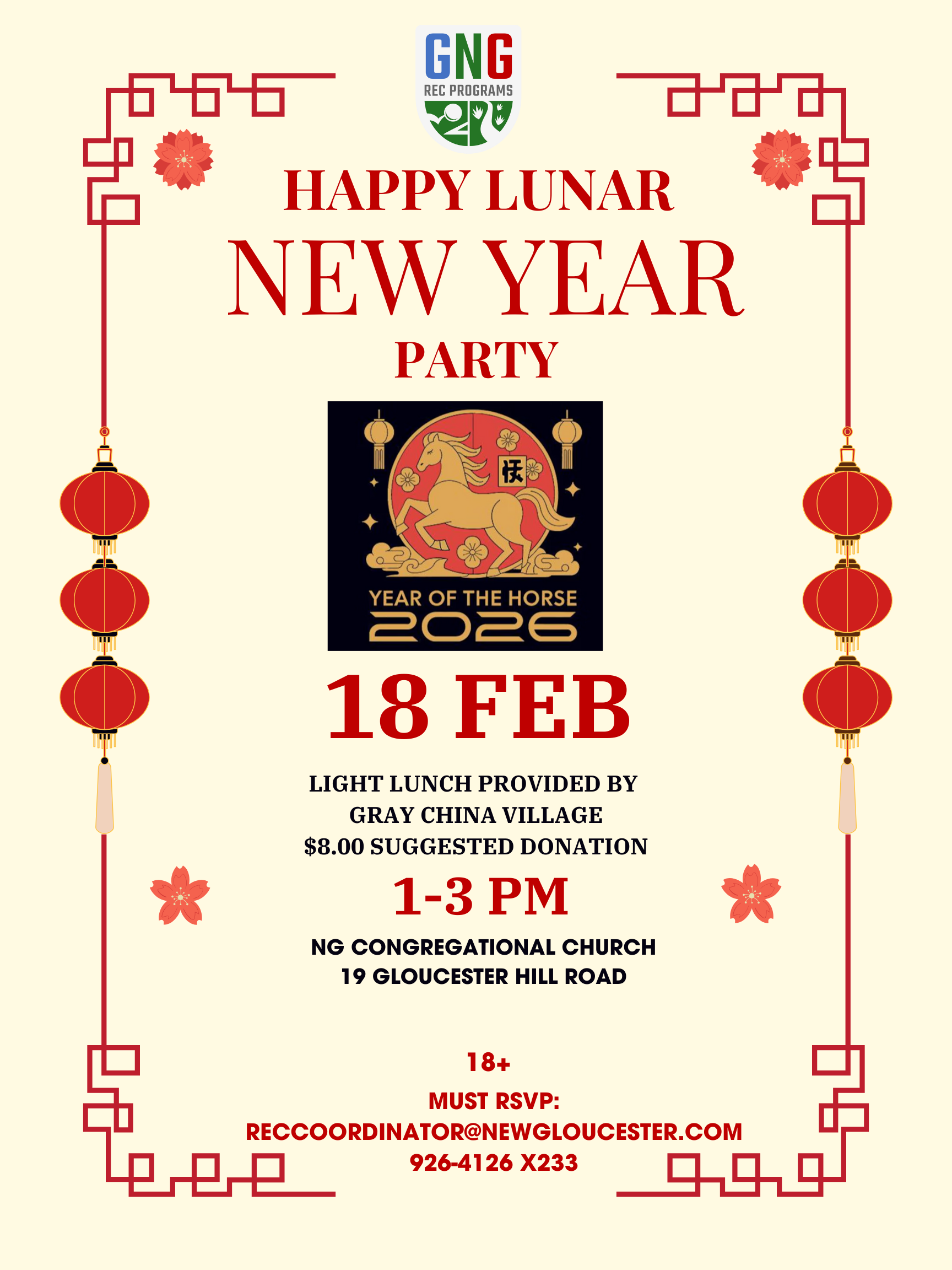 February 18, 2026 1pm-3pm, Lunar New Year Lunch! Come celebrate the Lunar New Year with a light lunch provided by Gray China Village. $8.00 donation suggested. 18+ event