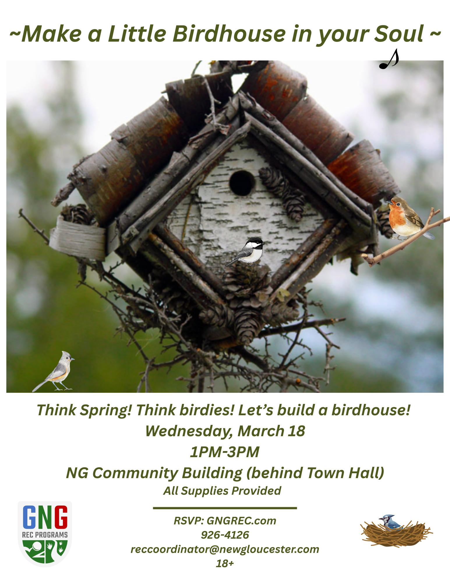 March 18, 2026 1pm-3pm, Make a little birdhouse in your soul! The birdies are coming back. Chirp Chirp! Think Spring! We are going to paint birdhouses and make homes for our feathered friends! Please note this will take place at the NG Community Building (behind Town Hall) All supplies provided. 18+